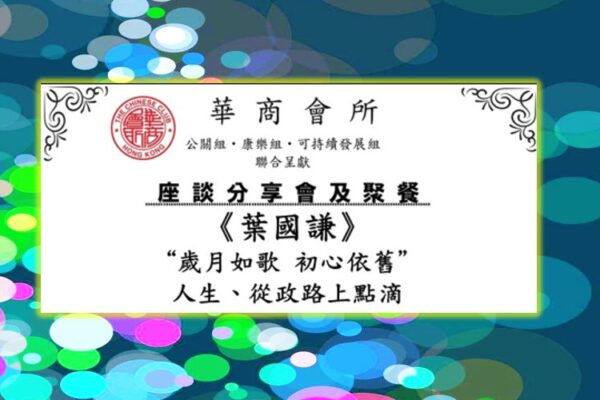 華 商 會 所 (公關組 ; 康樂組 ; 可持續發展組 聯合呈獻) 座 談 分 享 會 及 聚 餐 《葉國謙》…