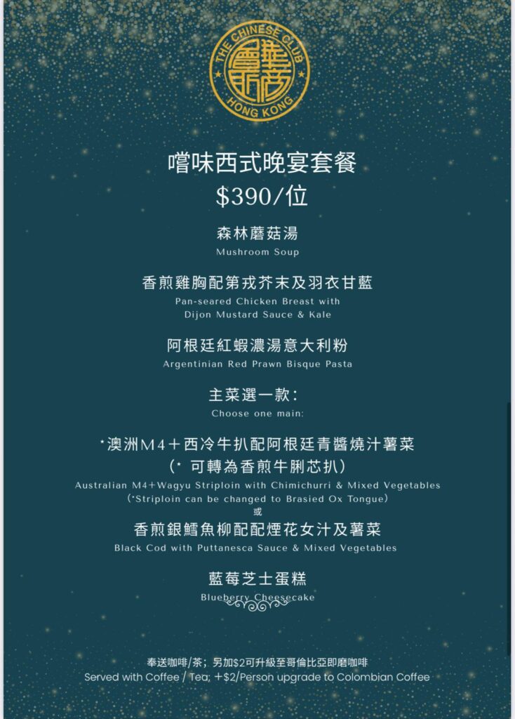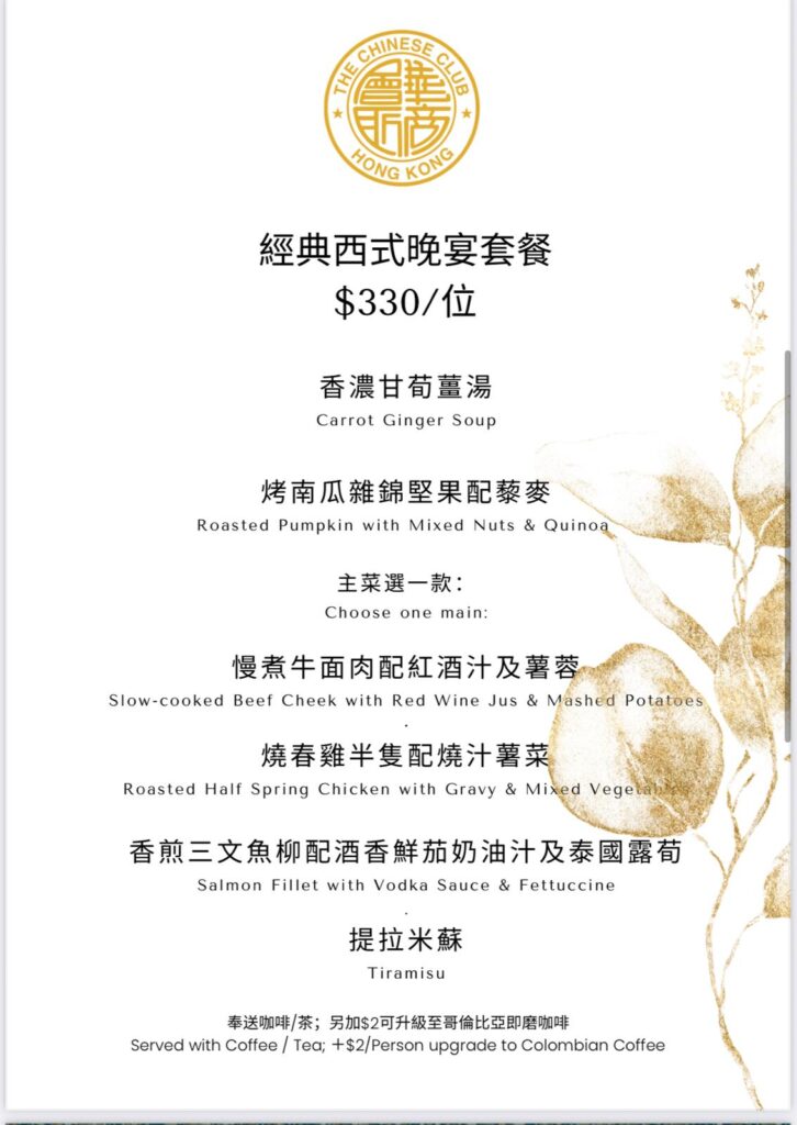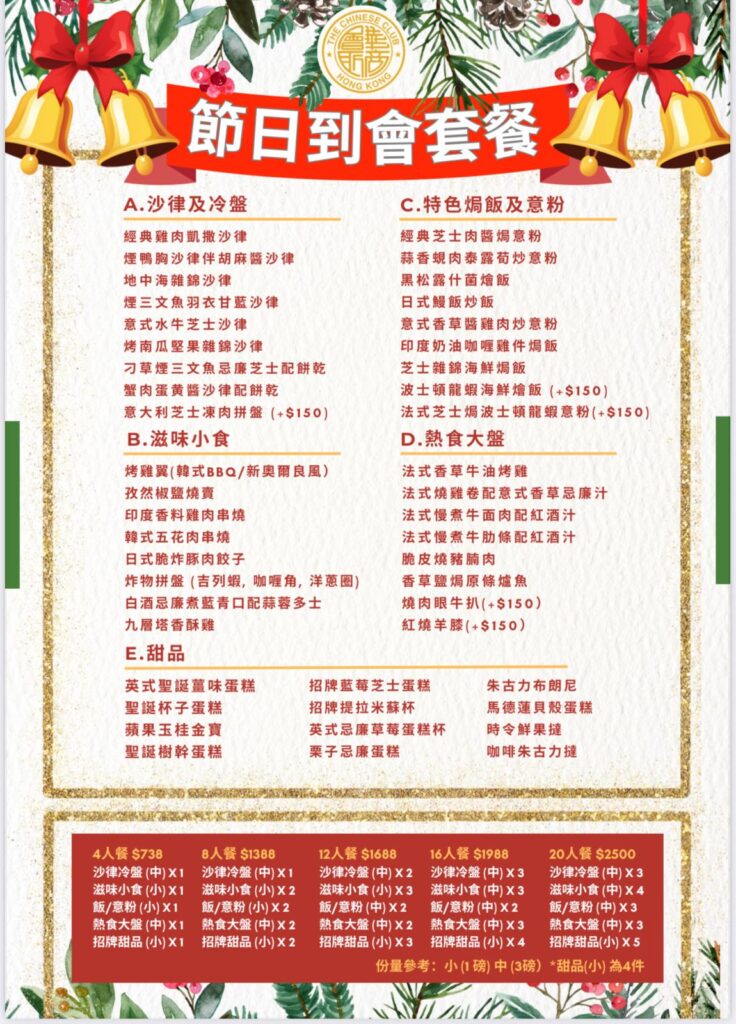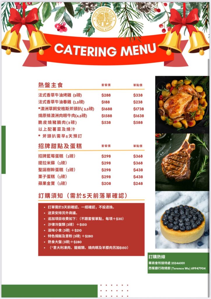Uncategorized最新通告會員活動會員活動紀錄餐飲信息聖誕節日套餐及節日到會菜單 – 歡迎預訂 David Chau1 週 ago01 mins 訂購熱線:華商會所接待處 25246001西餐廳⾏政總廚 (Terence Wu) 69947904 文章導覽 Previous: 隨心插花藝術班Next: 感恩節試酒會 Wine Tasting Event