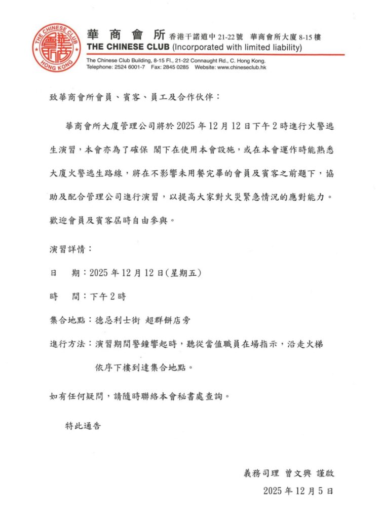 Uncategorized最新通告會員活動會員活動紀錄華商會所大廈管理公司安排「火警逃生演習」通告 David Chau12 小時 ago01 min 文章導覽 Previous: 中菜大廚呈獻:“冬至家宴 「由2025年12月12日至12月22日」推廣菜單”Next: 華商會所代為收集「大埔宏福苑火災賑災」捐款 通告