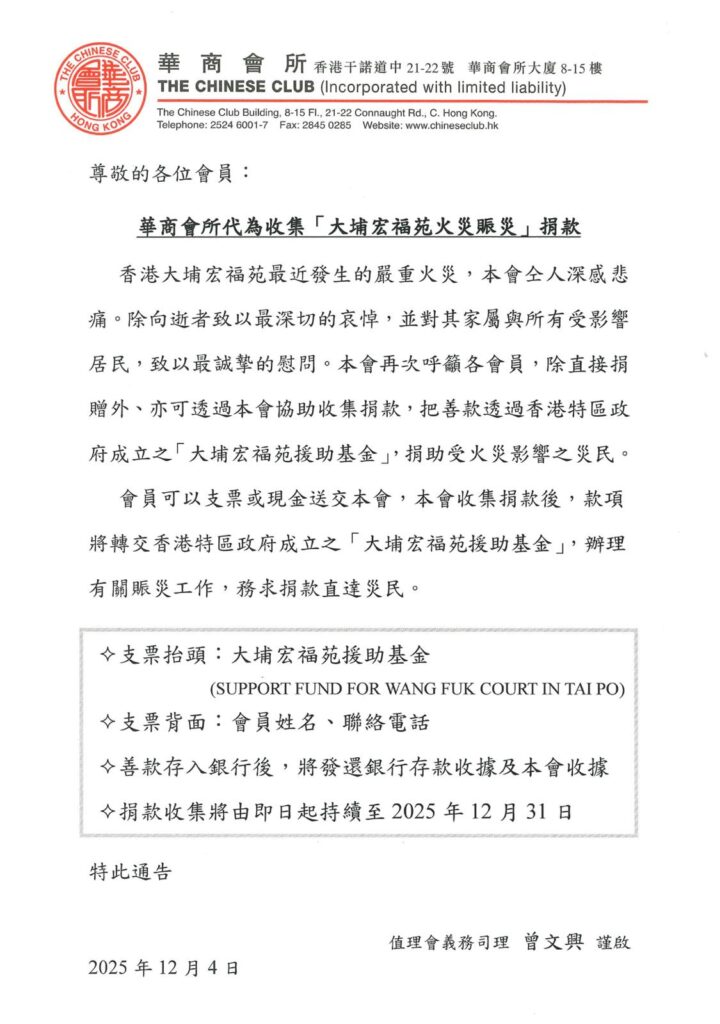 Uncategorized最新通告會員活動華商會所代為收集「大埔宏福苑火災賑災」捐款 通告 David Chau12 小時 ago01 min 文章導覽 Previous: 華商會所大廈管理公司安排「火警逃生演習」通告Next: 特別會信「2025年12月1日發出」