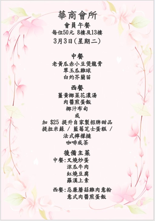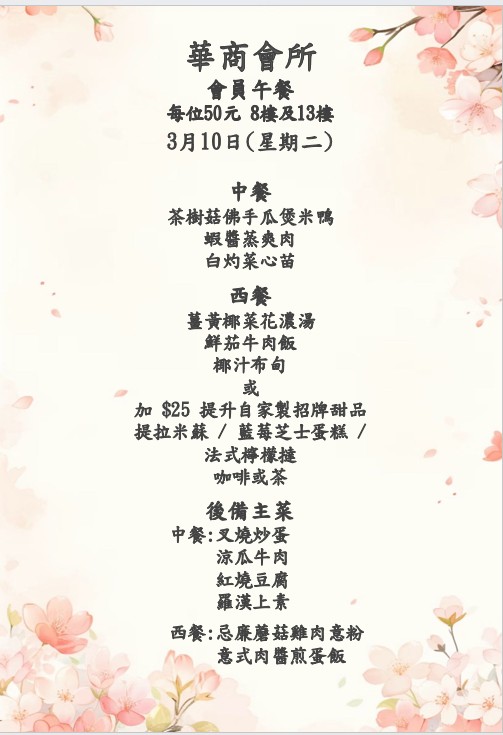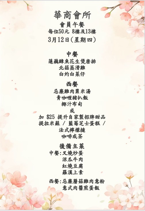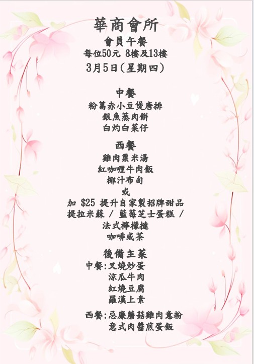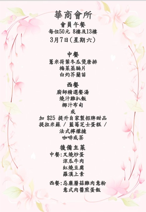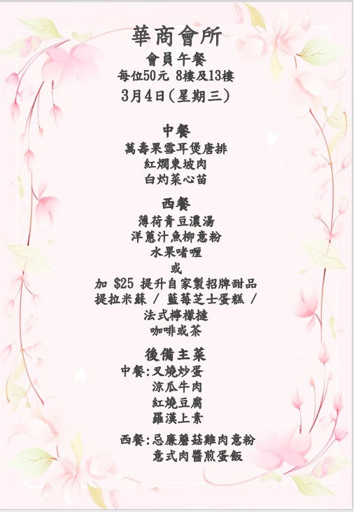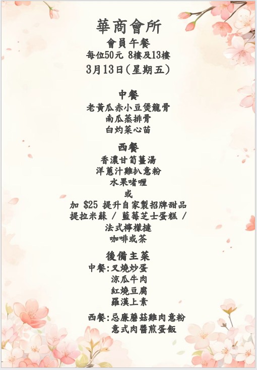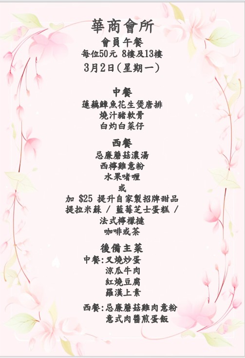 八樓 及 十三樓 會員中午套餐 (2026年 3月2日- 2026年3月7日)