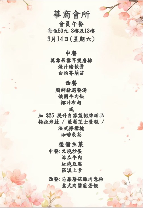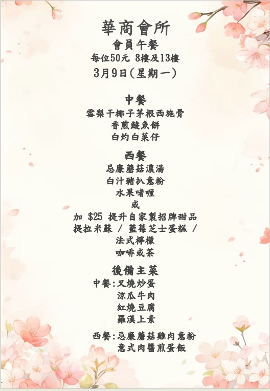 八樓 及 十三樓 會員中午套餐 (2026年3月9日- 2026年3月14日)