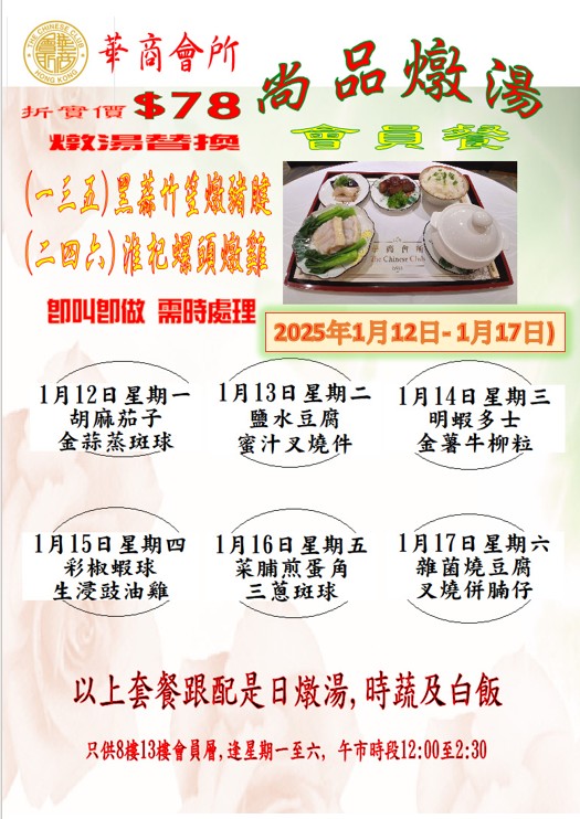「尚品燉湯」中式會員餐 (2026年1月12日- 2026年1月17日) 在會員層供應,每位折實78元。