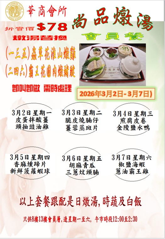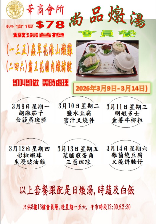 「尚品燉湯」中式會員餐 (2026年 3月2日- 2026年3月7日) 在會員層供應,每位折實78元。