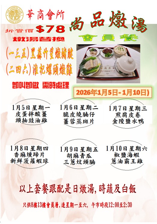 「尚品燉湯」中式會員餐 (2026年 1月5日- 2026年1月10日) 在會員層供應,每位折實78元。