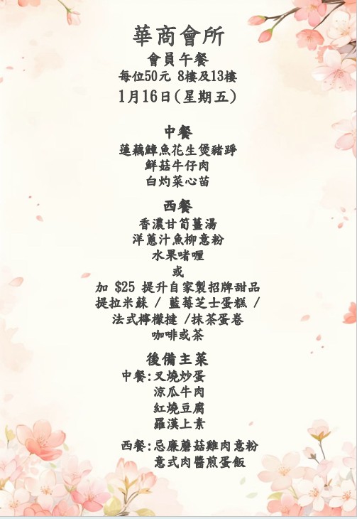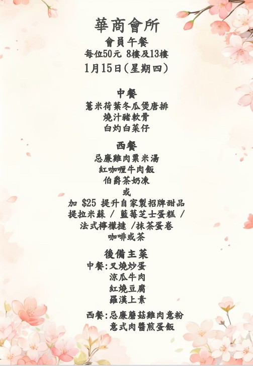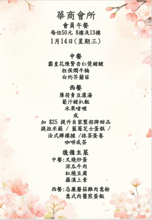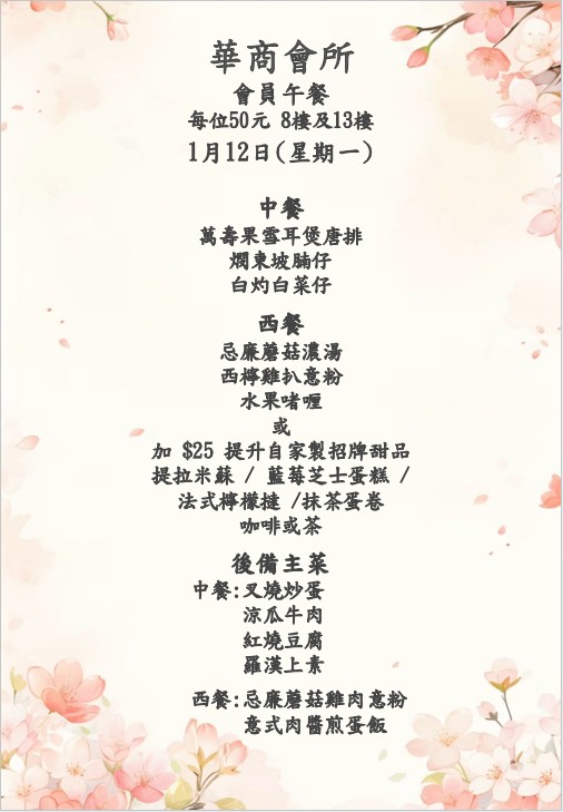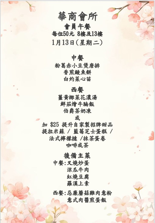 八樓 及 十三樓 會員中午套餐 (2026年1月12日- 2026年1月17日)