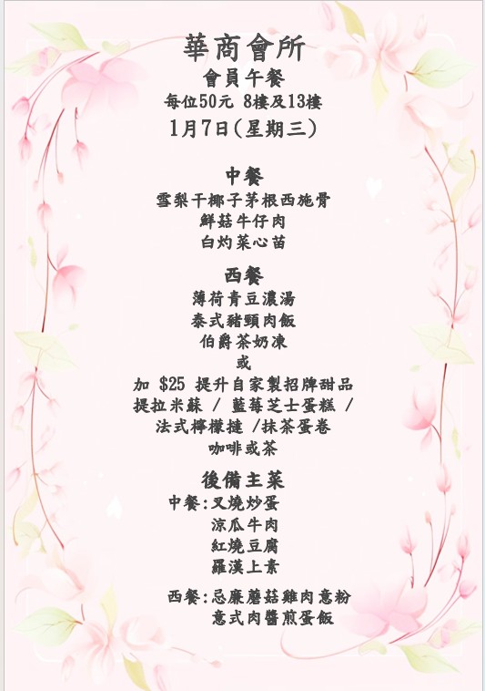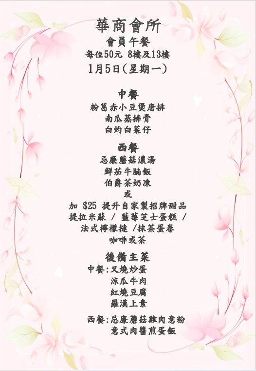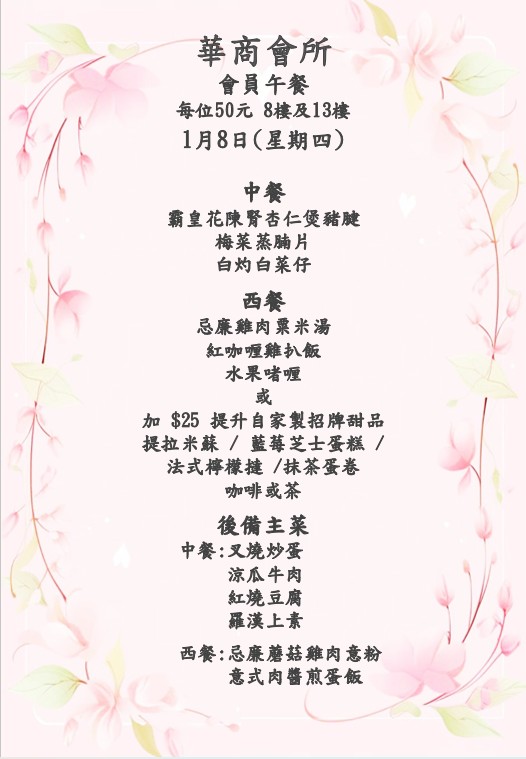 八樓 及 十三樓 會員中午套餐 (2026年 1月5日- 2026年1月10日)